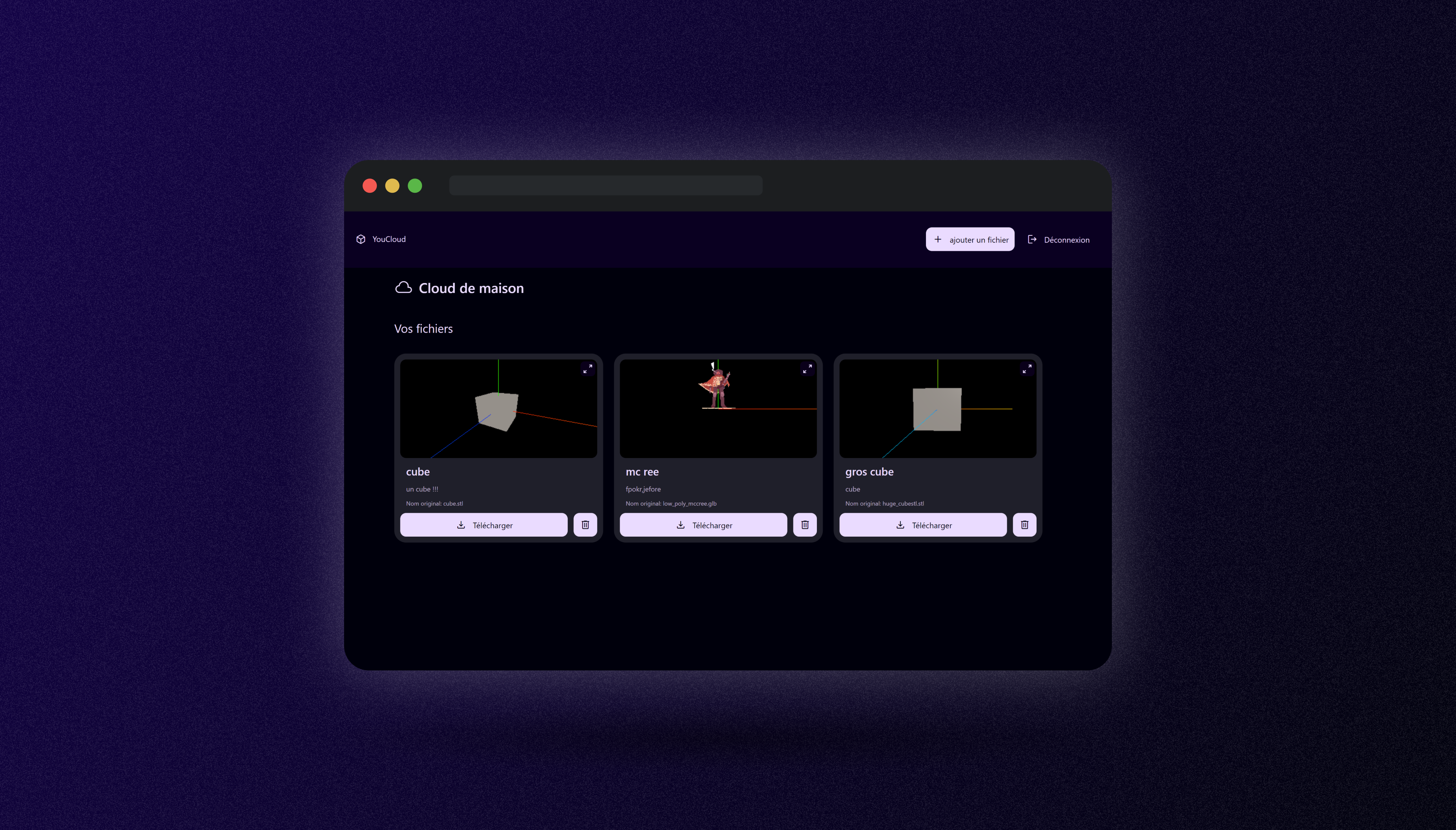 YouCloud a été réaliser dans le cadre d'un projet étudiant (SAE) lors de ma deuxième année de BUT MMI. Réalisé seul sur 3 jours consécutifs. L'objectif était de créer une application web permettant aux utilisateurs de stocker et de visualiser des fichiers 3Ds en ligne. L'idée était de fournir une plateforme simple et intuitive pour les créateurs de contenus 3D.